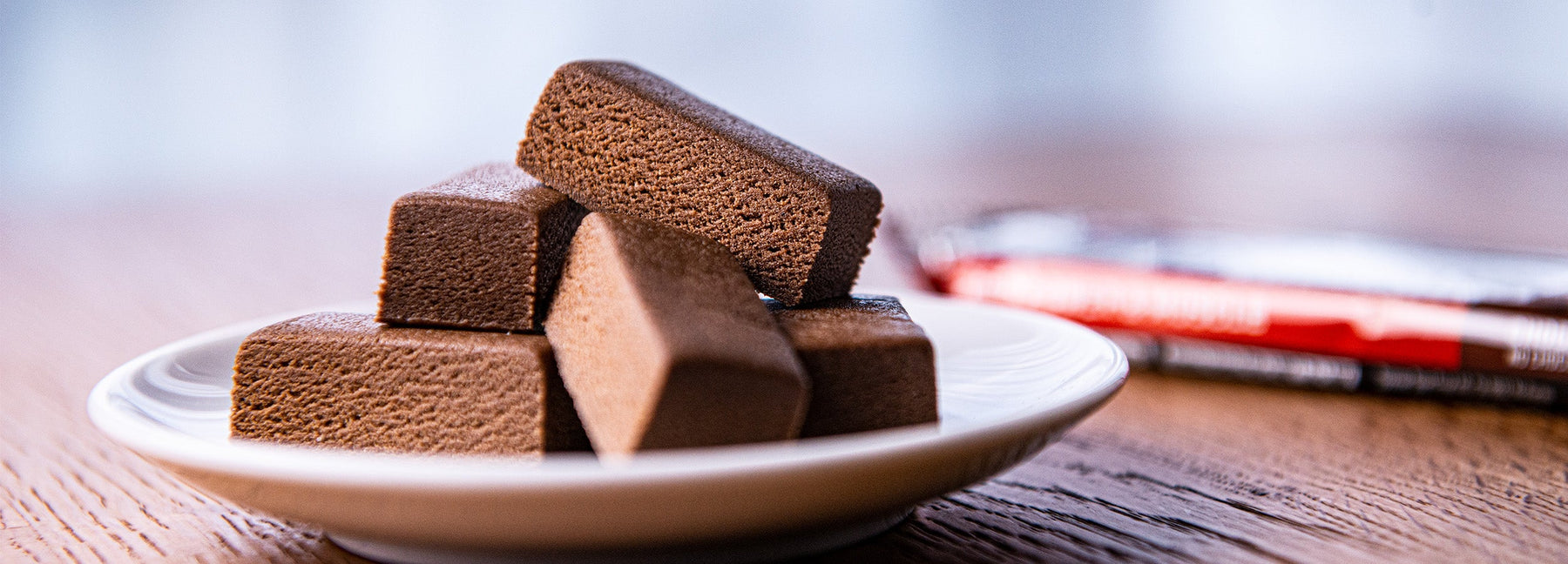 Milchprotein, Kollagenhydrolysat (Rind), Milchschokolade mit Süssungsmittel 17% (Süssungsmittel Maltitol, Kakaobutter, Vollmilchpulver, Kakaomasse, Emulgator Sojalecithin, Aroma), Feuchthaltemittel Glycerin, Wasser, Palmfett, Soja-Kakao-Crisps 3.6% (Sojaprotein, Kakaopulver, Tapiokastärke), Aroma, Süssungsmittel Sucralose. Kann Spuren von Gluten, Nüssen und Erdnüssen enthalten.